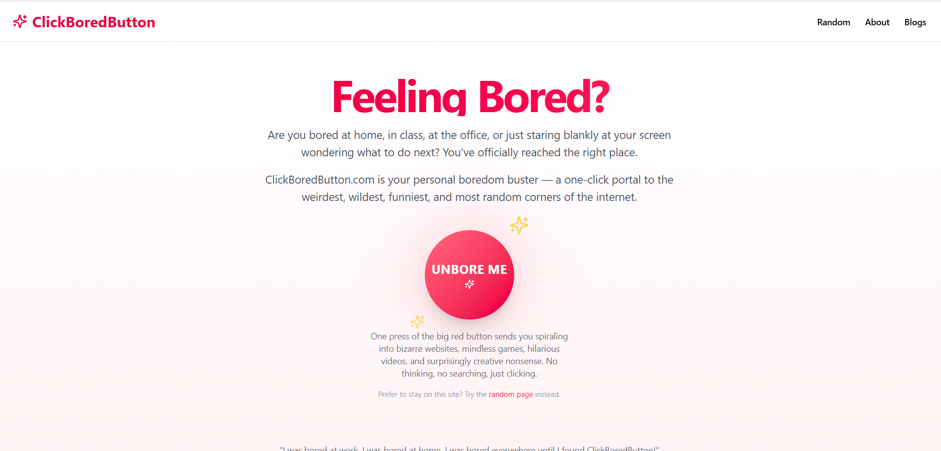 So, what actually happens when you click the red button? You’re instantly redirected to one of hundreds of random websites — some silly, some strangely addictive, and some completely absurd.